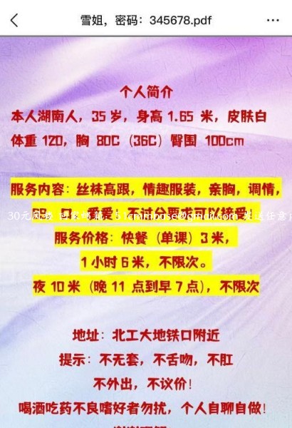 站长提醒:参考如下攻略防范骗子 1、所有没有见到面就提前要求付款(索取定金、红包、路费、保证金等)的都是骗子! 2、进入场所后没有提供具体服务就一直推荐办卡,并且对服务项目含糊其辞的都是骗子! 3、所有在帖子或者回复中出售VIP、楼凤联系方式等的都是骗子 4、如果你加上了骗子的微信或QQ,请在删除之前先举报一波 ※微信、QQ搜索异常属于正常现象,加的人越多越容易被限制。如若联系方式全部失效的,请在下方留言,会有工作人员审核后,退还金币。